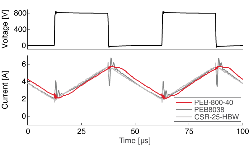 PEB-800-40は、あらゆる動作点において優れた電力定格を提供し、大電流アプリケーションではPEB8038、高速スイッチングコンバータではPEB8024のそれぞれの利点を統合することで、これら2つの先行製品に取って代わります。