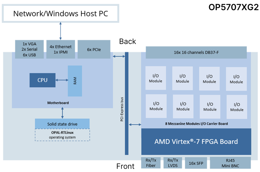 OP5707XG2は、Intelプロセッサによる超大規模モデルのリアルタイム演算と、FPGAによる超高速ループタイム(高速スイッチング周波数のリアルタイムシミュレーション)を両立する構成を採用しています。
