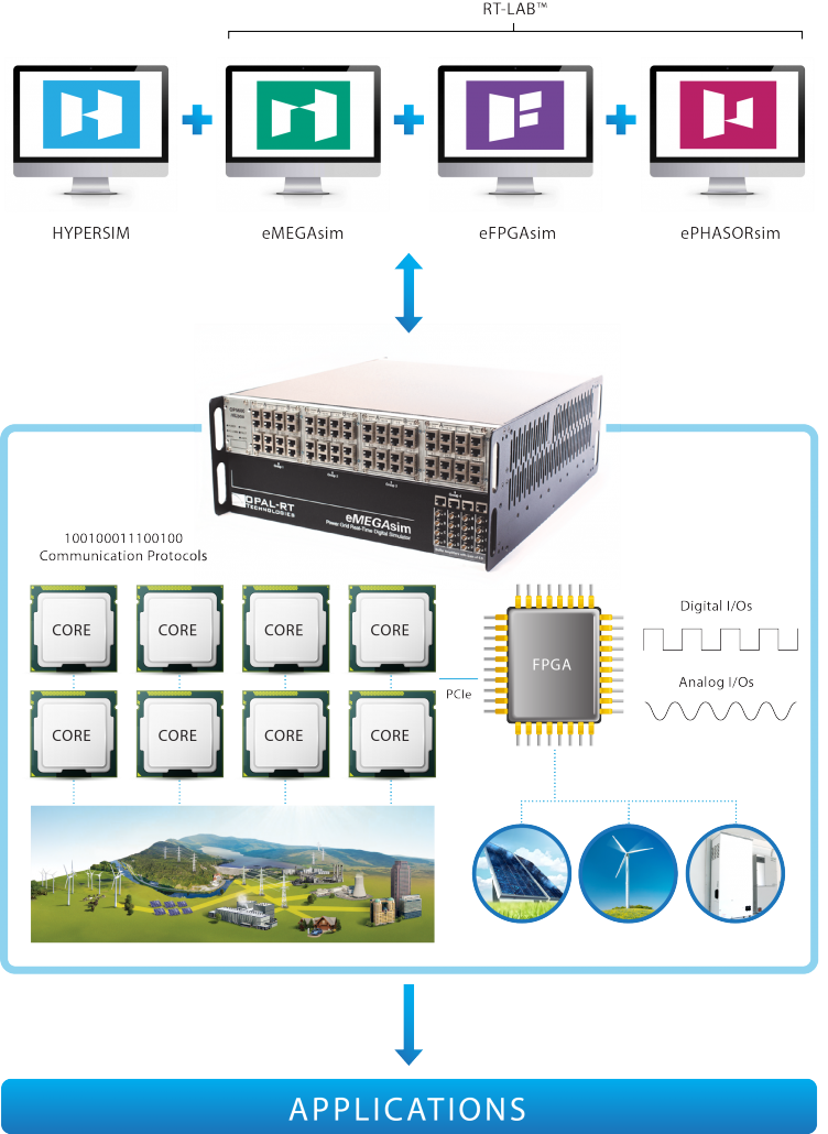 OPAL-RTは、送電網、パワーエレクトロニクス、モータードライブ、その他メカトロニクスシステム向けのリアルタイムシミュレーションおよび制御プロトタイピングシステムのすべてを提供します。これらのシステムには、実現可能性調査の実行、新しいコンセプトの開発、小型電力コンバータ、ハイブリッド電気駆動装置、大型電力グリッド、再生可能エネルギーシステムなどの幅広いアプリケーション向けのコントローラの設計とテストに役立つ最先端のソフトウェアインターフェイスとハードウェアプラットフォームが含まれています。