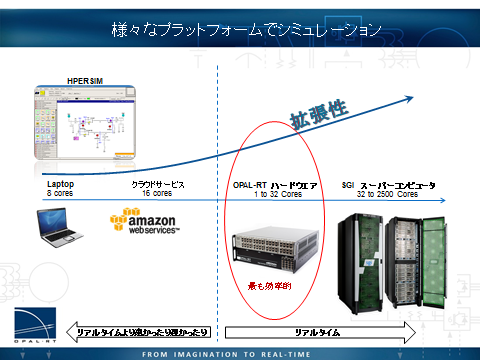 HYPERsimは目的に応じて様々なプラットフォームをご選択いただけます。リアルタイムが必ずしも必要ではない場合には、机上のラップトップPCや、やや規模が大きい系統の場合にはクラウドサービスをご利用いただくことができます。