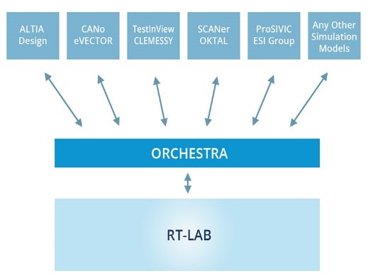 RT -LAB Orchestraは、異なるコシミュレーションコンポーネント間の統合と相互運用を促進し、設計プロセスの早い段階で仮想車両のReal-Time co-simulationを実行します。