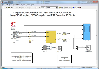 モデルにはシミュレーションのすべての部分が含まれ、FPGA HDLコードは自動的に生成されてRT-XSGによってディスパッチされます。
