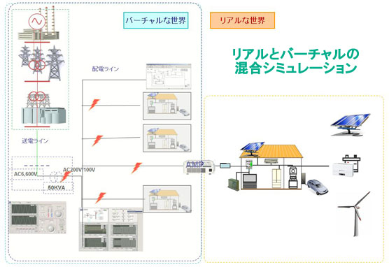 マイクログリッド実証実験はeMEGAsimリアルタイムシミュレータ内に置かれた配電回路に 各家庭の負荷電流を注入することで、電力網と家庭内の機器との相互関係を解析します。