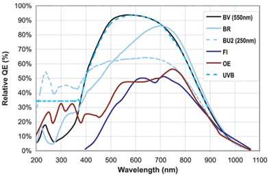 CCD検出器は一定の間隔ごとにリニアに素子が並べられていますが、波長方向に対して感度特性を持っています。