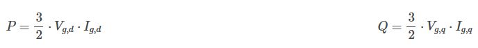 系統追従型インバータの制御目的は、通常、系統への有効電力および無効電力の注入量を制御することです。系統電圧に同期した回転座標系(dq座標系)において、有効電力と無効電力は次のように表されます: