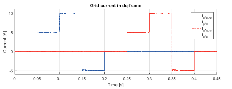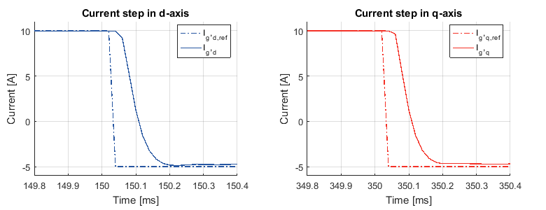 本技術ノートでは、回転座標系(dq座標系)における電流指令値 𝐼𝑔,および 𝐼𝑔,𝑞を用いて、有効電力および無効電力の潮流を直接制御します。系統電流の各成分は、「ベクトル電流制御(Vector Current Control)」で紹介されている手法と同様に、系統同期座標系(dq座標系)上の2つのPIコントローラによって制御されます。