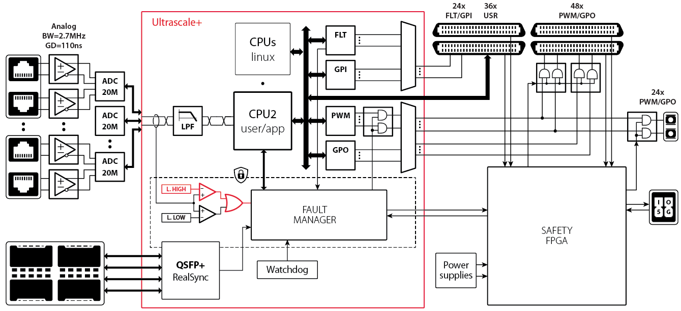 B-Box 4 RCP コントローラには、ユーザアプリケーションとは完全に独立して動作するハードウェア保護機能が内蔵されています。これにより、制御アルゴリズムがまだ十分に検証されていない実験初期段階を含め、接続された電力機器を確実に保護することができます。