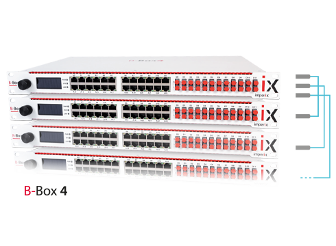 B-Box 4 は単独で使用することも、複数台を組み合わせて高度な I/O 機能を実現することもできます。最大 64 台までのデバイスをサポートするさまざまな拡張モードに対応しています。RealSync により、スタックされたコントローラはネットワーク全体で ±2ns の精度で自動的に同期されます。