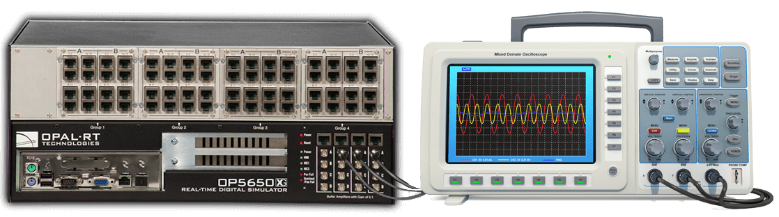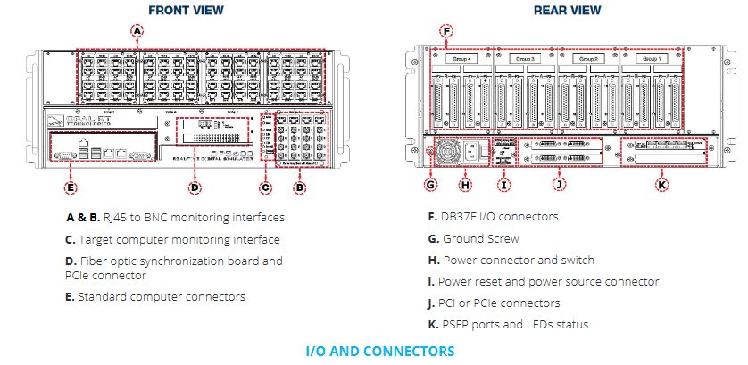 上部セクションにはアナログおよびデジタルI / O信号モジュールが含まれ、下部セクションにはマルチコアプロセッサコンピューターとリアルタイムシミュレーションソフトウェアのOPAL-RTスイート全体を実行できるFPGAが含まれます。