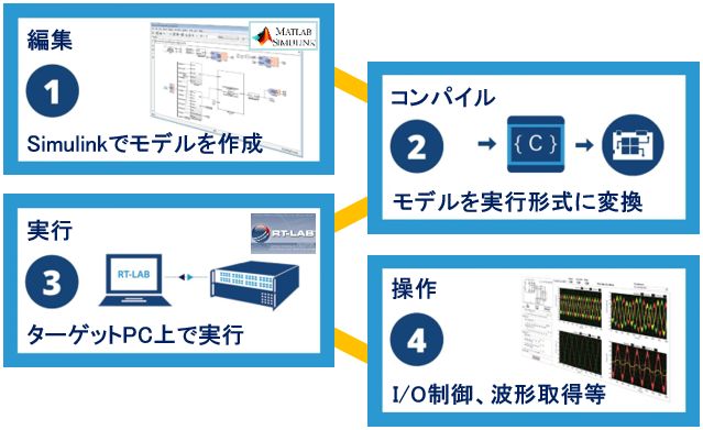 MATLAB/Simulinkで作成されたモデルから実行形式への変換処理(コンパイル)やシミュレーションの準備、実行等は画面上のボタンのワンクリックで自動的に行われます。シミュレーション実行中の波形等はSimulinkモデルや専用に構築したGUI画面で表示することが可能です。