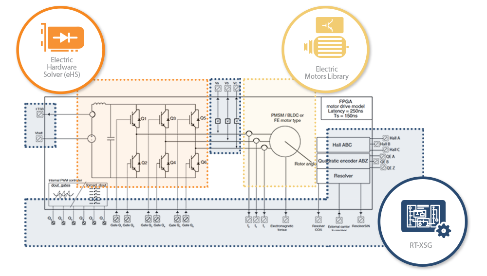 RT-LAB上で動くOPAL-RTのFPGA Electric Machine Libraryは、eFPGASIM独自のソフトウェア環境に統合され、コントローラーとパワーエレクトロニクスおよび電気駆動システムの設計とテストに最適なプラットフォームです。