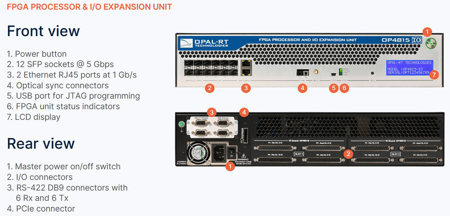 OP4800シリーズは、OPAL-RT互換シミュレータとのシームレスな統合を実現するFPGAプロセッサとI/O拡張ユニットで構成されています。